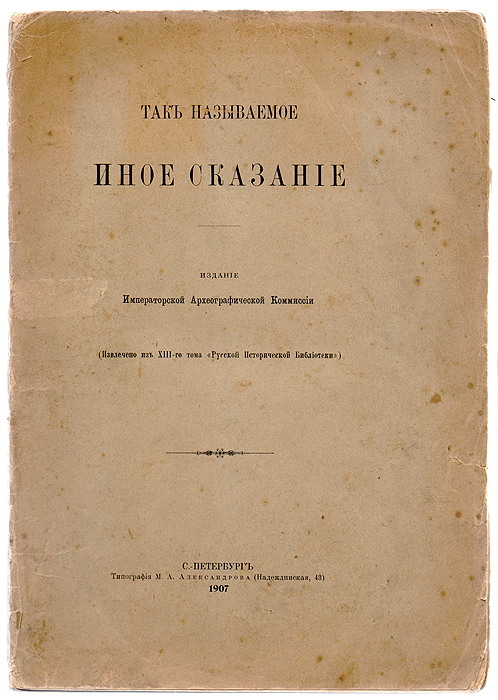 Издание Императорской Археографической Комиссии. Текст этого памятника, под заглавием "Иное Сказание о самозванцах", первоначально был напечатан в XVI-й книге Временника Императорского Московского Общества Истории и Древностей Российских (1856 год). При вторичном издании XIII-го тома "Русской Исторической Библиотеки" Императорская Археографическая Комиссия постановила некоторые важнейшие по значению памятники, входящие в состав этого тома, отпечатать отдельными оттисками. В силу этого постановления "Так называемое Иное Сказание" издается в виде отдельной брошюры.