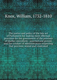 | Полное название книги | William Knox The justice and policy of the late act of Parliament for making more effectual provision for the government of the province of Quebec microform |