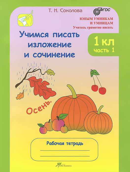 | Полное название книги | Т. Н. Соколова Учимся писать изложение и сочинение. 1 класс. Рабочая тетрадь. В 2 частях. Часть 1 |