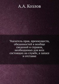 | Полное название книги | А. А. Козлов Указатель прав, преимуществ, обязанностей и вообще сведений и справок, необходимых для всех состоящих на службе, в запасе и отставке |
