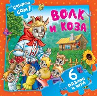 На толстых страничках находится 6 пазлов с крупными деталями, которые удобно собирать детскими пальчиками. В книге представлена сказка «Волк и Коза» в пересказе А.Н.Афанасьева.
