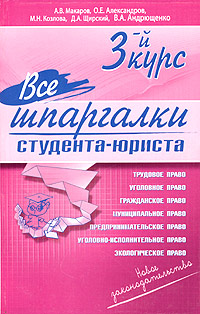 | Полное название книги | Д. А. Щирский, М. Н. Козлова, О. Е. Александров, В. А. Андрющенко, А. В. Макаров Все шпаргалки студента-юриста. 3-й курс |