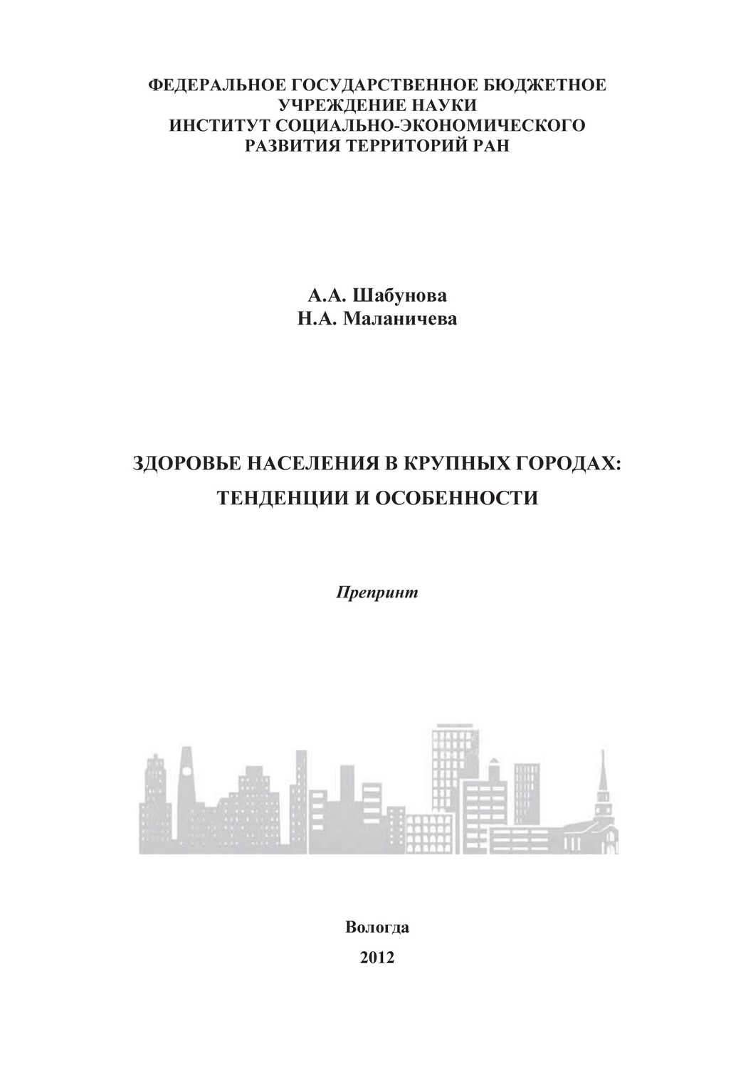 | Полное название книги | Шабунова Александра Анатольевна, Маланичева Надежда Анатольевна Здоровье населения в крупных городах: тенденции и особенности |