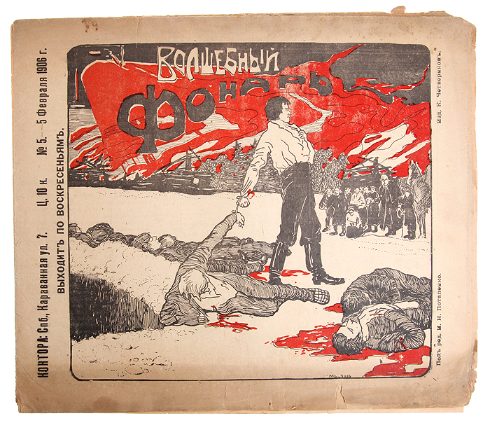 Санкт-Петербург, 1906 год. Электропечатня К. А. Четверикова. Типографская обложка. Сохранность хорошая. № 5 журнала "Волшебный фонарь" за февраль 1906 года. "Волшебный фонарь" - еженедельный журнал общественной и политической сатиры и карикатуры. Издавался в Санкт-Петербурге в 1905-1906 гг. под редакцией И. Н. Потапенко. Не подлежит вывозу за пределы Российской Федерации. Это и многое другое вы найдете в книге Журнал "Волшебный фонарь". № 5, 1906 год