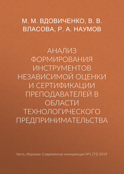 | Полное название книги | В. В. Власова, М. М. Вдовиченко, Р. А. Наумов Анализ формирования инструментов независимой оценки и сертификации преподавателей в области технологического предпринимательства |