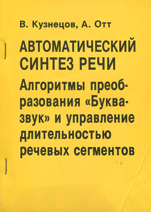 | Полное название книги | А. Отт, В. Кузнецов Автоматический синтез речи. Алгоритмы преобразования "Буква-звук" и управление длительностью речевых сегментов |