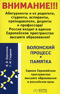 | Полное название книги | В. Б. Кириллов, Г. И. Гладков Болонский процесс. Памятка. Единое Европейское пространство высшего образования и российские вузы |