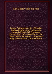 | Полное название книги | Carl Gustav Jakob Jacobi Canon Arithmeticus Sive Tabulae Quibus Exhibentur Pro Singulis Numeris Primis Vel Primorum Potestatibus Infra 1000 Numeri Ad Datos Indices Et Indices . Litterarum Regiae Borussicae (Latin Edi |