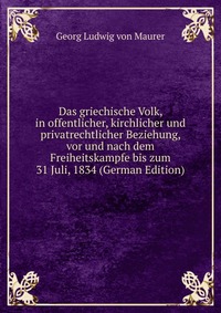 Das griechische Volk in offentlicher, kirchlicher und privatrechtlicher Beziehung, vor und nach dem Freiheitskampfe bis zum 31, Juli 1834. Воспроизведено в оригинальной авторской орфографии издания 1835 года (издательство "Heidelberg: in der Akademishen Buchhandlung von J. G. B. Mohr"). Это и многое другое вы найдете в книге Das griechische Volk, in offentlicher, kirchlicher und privatrechtlicher Beziehung, vor und nach dem Freiheitskampfe bis zum 31 Juli, 1834 (German Edition) (Georg Ludwig von Maurer)