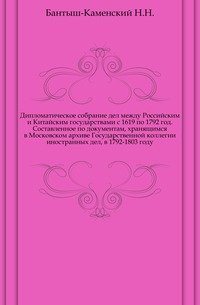 | Полное название книги | Н. Н. Бантыш-Каменский Дипломатическое собрание дел между Российским и Китайским государствами с 1619 по 1792 год |