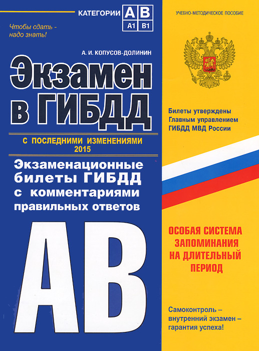 | Полное название книги | А. И. Копусов-Долинин Экзамен в ГИБДД. Категории А, В. Экзаменационные билеты ГИБДД с комментариями правильных ответов |