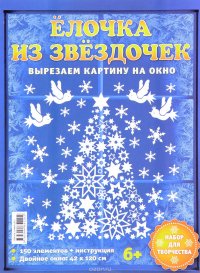 Как вырезать картину? Нам понадобятся: канцелярский или макетный нож, маникюрные или обычные ножницы, коврик для резки, металлическая линейка. Начинайте вырезать с внутренних элементов: от самых мелких к более крупным. На последнем этапе вырезайте деталь по контуру. Чтобы вырезать мелкие кружочки, сделайте сначала небольшую метку канцелярским ножом. Затем вырезайте кружочки маникюрными ножницами. Канцелярским ножом аккуратно вырежьте внутренние звездочки, которые при желании можно использовать для дополнительного украшения окна. Внимание! Контуры для вырезания нанесены на обратную сторону деталей, поэтому именно этой стороной приклеивайте детали на окно. Для более качественного вырезания почаще меняйте лезвие. Длинные прямые линии вырезайте при помощи металлической линейки. Макетный коврик для резки можно заменить куском линолеума на вспененной основе, перевернув его на изнаночную, гладкую сторону. Подойдет также и большая разделочная доска. В наборе: 100 элементов + инструкция. ... Это и многое другое вы найдете в книге Елочка из звездочек. Набор для творчества (Ангелика Кипп)