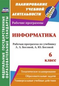 В пособии представлена рабочая программа по информатике для 6 класса, разработанная в соответствии с основными положениями федерального государственного образовательного стандарта основного общего образования, планируемыми результатами, требованиями Примерной основной образовательной программы ОУ и авторской программы Л.Л.Босовой, А.Ю.Босовой, ориентированная для работы по учебнику Л.Л.Босовой, А.Ю.Босовой (М.: БИНОМ. Лаборатория знаний, 2013).