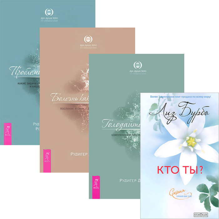 В комплект вошли 4 книги: Лиз Бурбо "Кто ты?" (серия "Слушай свое тело"), Рудигер Дальке "Голодайте во благо. Комплексная программа голодания" (серия "Дух-душа-тело"), Рудигер Дальке, Роберт Хесль "Проблемы пищеварения. Какие задачи скрываются за желудочными и кишечными симптомами" (серия "Дух-душа-тело") и Рудигер Дальке "Болезнь как язык души. Послание и смысл ваших заболеваний" (серия "Дух-душа-тело"). Это и многое другое вы найдете в книге Кто ты + Голодайте во благо + Проблемы пищеварения + Болезнь как язык души (4553) (-)