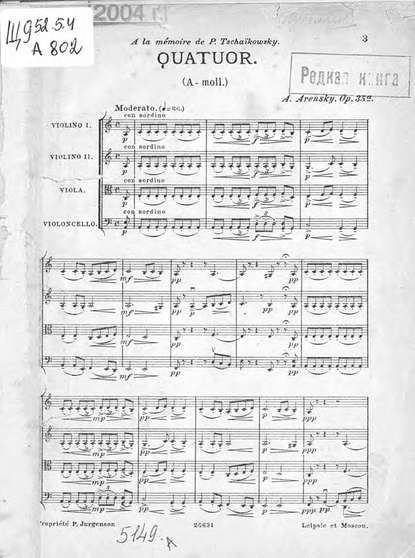 | Полное название книги | Антон Степанович Аренский, Квартет a moll для двух скрипок, альта и виолончели |