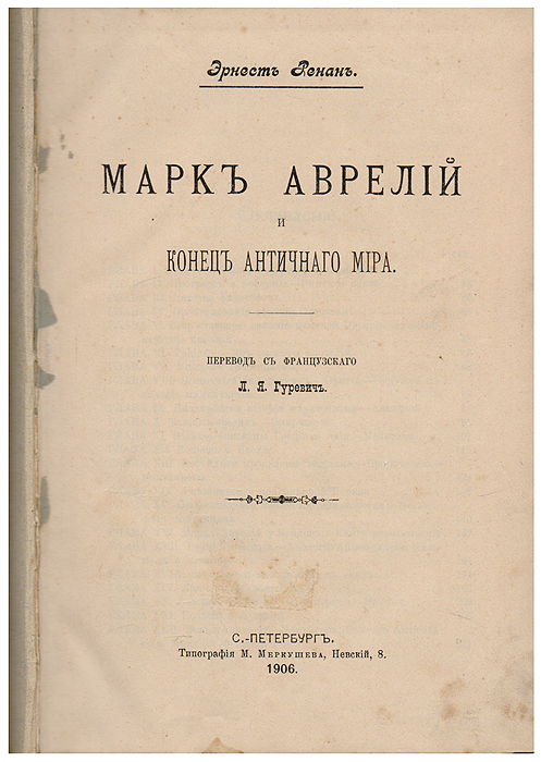 Этим томом заканчивается ряд очерков, посвященных Эрнестом Ренаном возникновению христианства. Он содержит изложение развития христианской церкви в царствование Марка-Аврелия и параллельную этому картину усилий философии, направленных к улучшению гражданского общества.