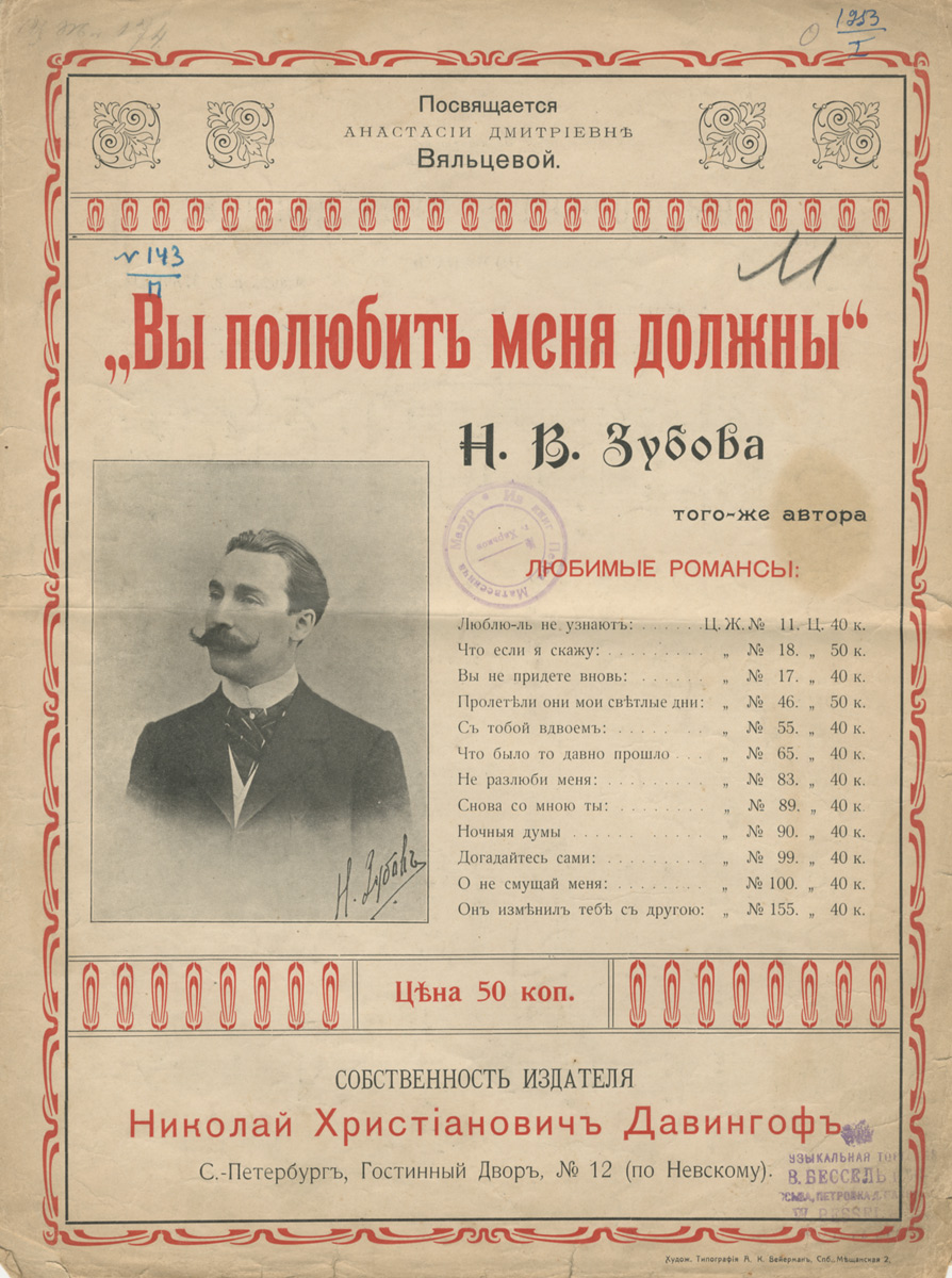 В издании представлен нотный текст и слова романса Н.В.Зубова ВЫ ПОЛЮБИТЬ МЕНЯ ДОЛЖНЫ.