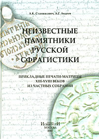 | Полное название книги | А. К. Станюкович, А. Г. Авдеев Неизвестные памятники русской сфрагистики. Прикладные печати-матрицы XIII-XVIII веков из частных собраний |
