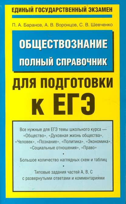 | Полное название книги | Александр Викторович Воронцов, Сергей Владимирович Шевченко, Петр Анатольевич Баранов Обществознание. Полный справочник для подготовки к ЕГЭ |