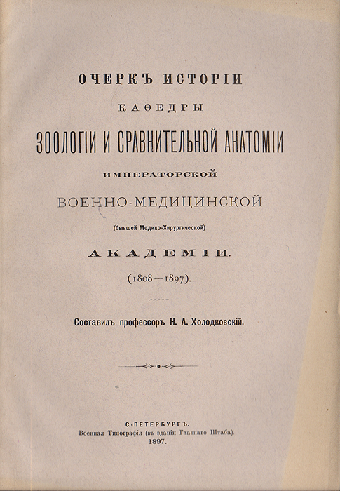 | Полное название книги | Очерк истории кафедры зоологии и сравнительной анатомии Императорской Военно-Медицинской Академии (1808-1897) |