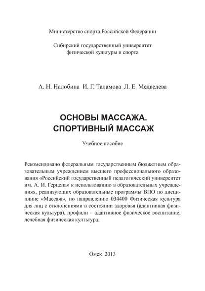 | Полное название книги | Людмила Ефимовна Медведева, Анна Николаевна Налобина, Ирина Геннадьевна Таламова Основы массажа. Спортивный массаж |