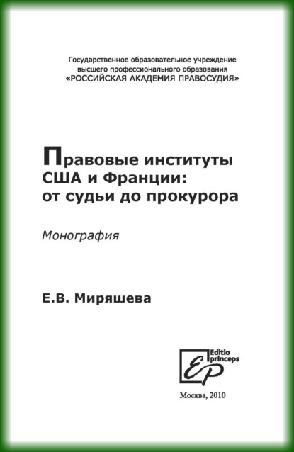 На сайте представлено только описание и выходные данные книги «Правовые институты США и Франции: от судьи до прокурора Екатерина Владимировна Миряшева». Сайт не является распространителем книги. Сайт не предоставляет возможности купить, читать онлайн или скачать бесплатно книгу «Правовые институты США и Франции: от судьи до прокурора Екатерина Владимировна Миряшева». Сайт предназначен для лиц старше 18 лет. Если вам не исполнилось 18 лет - незамедлительно покиньте сайт. Оставаясь на сайте вы подтвердаете, что вам исполнилось 18 лет.