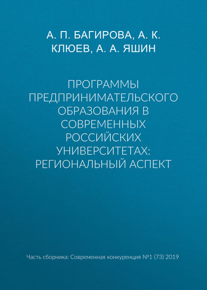 | Полное название книги | А. А. Яшин, А. К. Клюев, Анна Петровна Багирова Программы предпринимательского образования в современных российских университетах: региональный аспект |