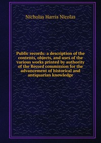 | Полное название книги | Nicholas Harris Nicolas Public records: a description of the contents, objects, and uses of the various works printed by authority of the Record commission for the advancement of historical and antiquarian knowledge |