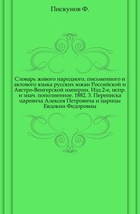 | Название транслитом | slovar-zhivogo-narodnogo-pismennogo-i-aktovogo-yazyka-russkih-yuzhan-rossiyskoy-i-avstro-vengerskoy-imperii-izd-2-e-ispr-i-znachast-popolnennoe-1882-3-perepiska-carevicha-alekseya-petrovich-kollektiv-avtorov |