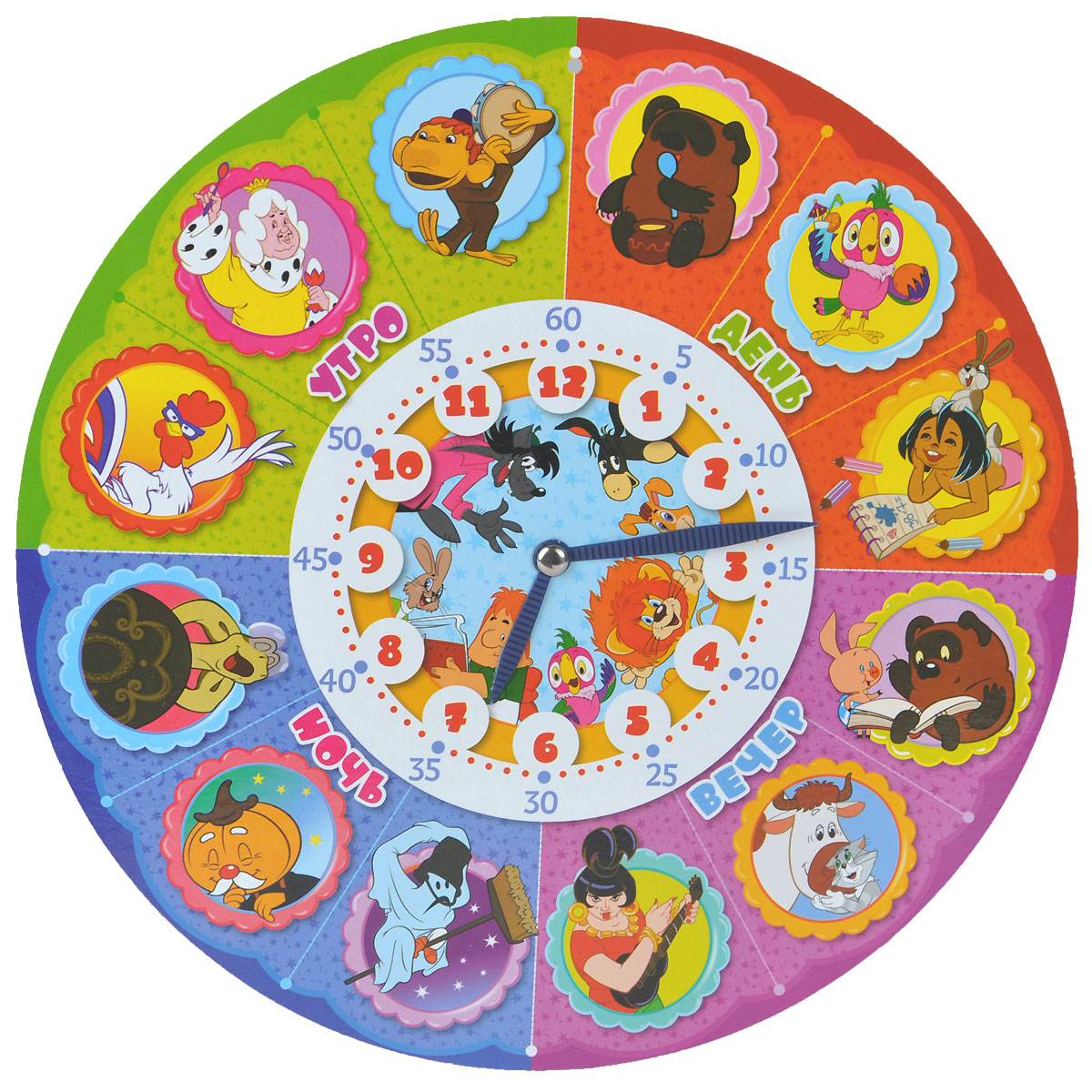 Красочная двусторонняя игрушка с героями любимых отечественных мультфильмов поможет малышу научиться узнавать время по часам, составлять распорядок дня, запомнить правильную последовательность месяцев и сезонов в году. Добрые друзья - герои Союзмультфильма с удовольствием помогут ему.