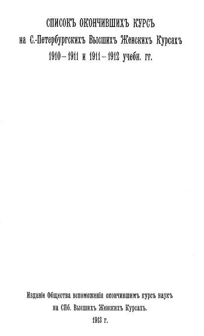 | Полное название книги | Коллектив авторов, Список окончивших курс на С.-Петербургских высших женских курсах, 1910-1911 и 1911-1912 учеб. гг. |