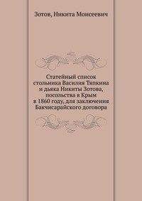 | Полное название книги | Никита Моисеевич, Зотов Статейный список стольника Василия Тяпкина и дьяка Никиты Зотова, посольства в Крым в 1860 году, для заключения Бакчисарайского договора |