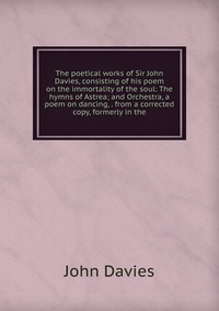 | Полное название книги | John Davies The poetical works of Sir John Davies, consisting of his poem on the immortality of the soul: The hymns of Astrea; and Orchestra, a poem on dancing, . from a corrected copy, formerly in the |