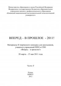 Представлены материалы II творческого конкурса «Вперед – в прошлое!» школьников, учащихся учреждений НПО и СПО. Цель конференции – привлечение внимания детей и молодежи к историко-культурному наследию народов, населяющих Татарстан, к традициям научных школ города Казани; воспитание патриотизма и гордости за свою Родину, формирование бережного отношения к народным традициям, привлечение внимания к проблеме сохранения памятников старины; творческое развитие личности детей,формирование у них мотивации к познанию и творчеству, стимулирование различных видов и форм индивидуальной и групповой деятельности, обмен творческими достижениями. Это и многое другое вы найдете в книге Вперед – в прошлое – 2011! Часть 2 (Е. Л. Кузьмишин)
